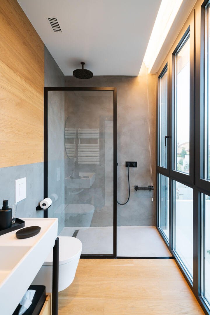La casa de invitados es más pequeña, en la parte trasera, y tiene acceso desde la calle de atrás. Abrimos grandes ventanales a la luz y las vistas, pero protegiéndolos con la forma de los muros que los rodean, dando a la casa su aspecto final.